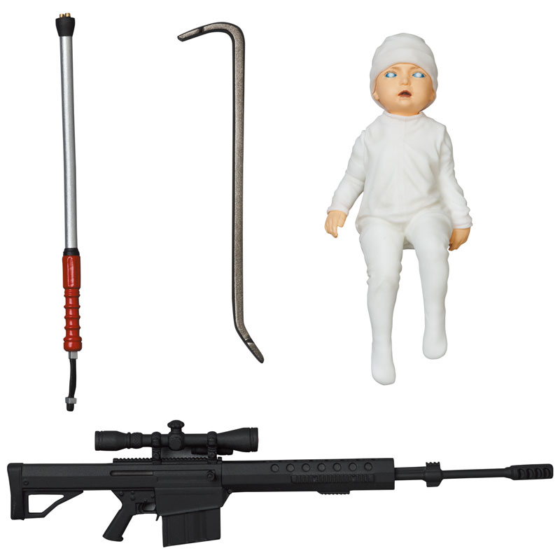 Comes with interchangeable body parts, removable coat, rifle and weapons