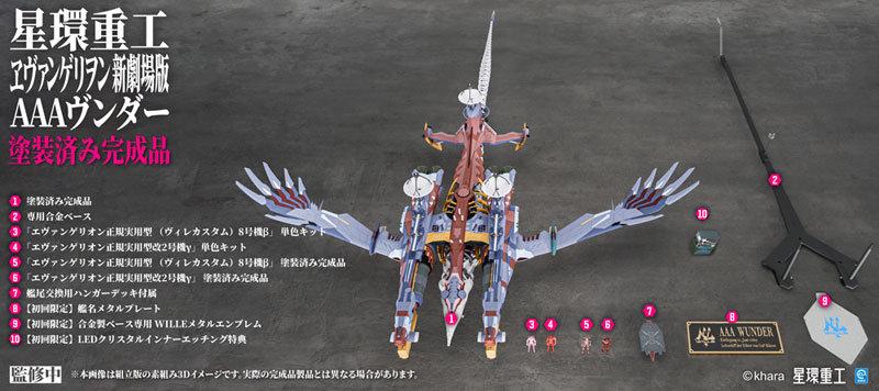 Additionally, the pre-painted, pre-assembled version includes a metal nameplate for the ship, and pre-painted Evangelion Production Models Eva-08β (WILLE configuration) and Eva-02'γ.