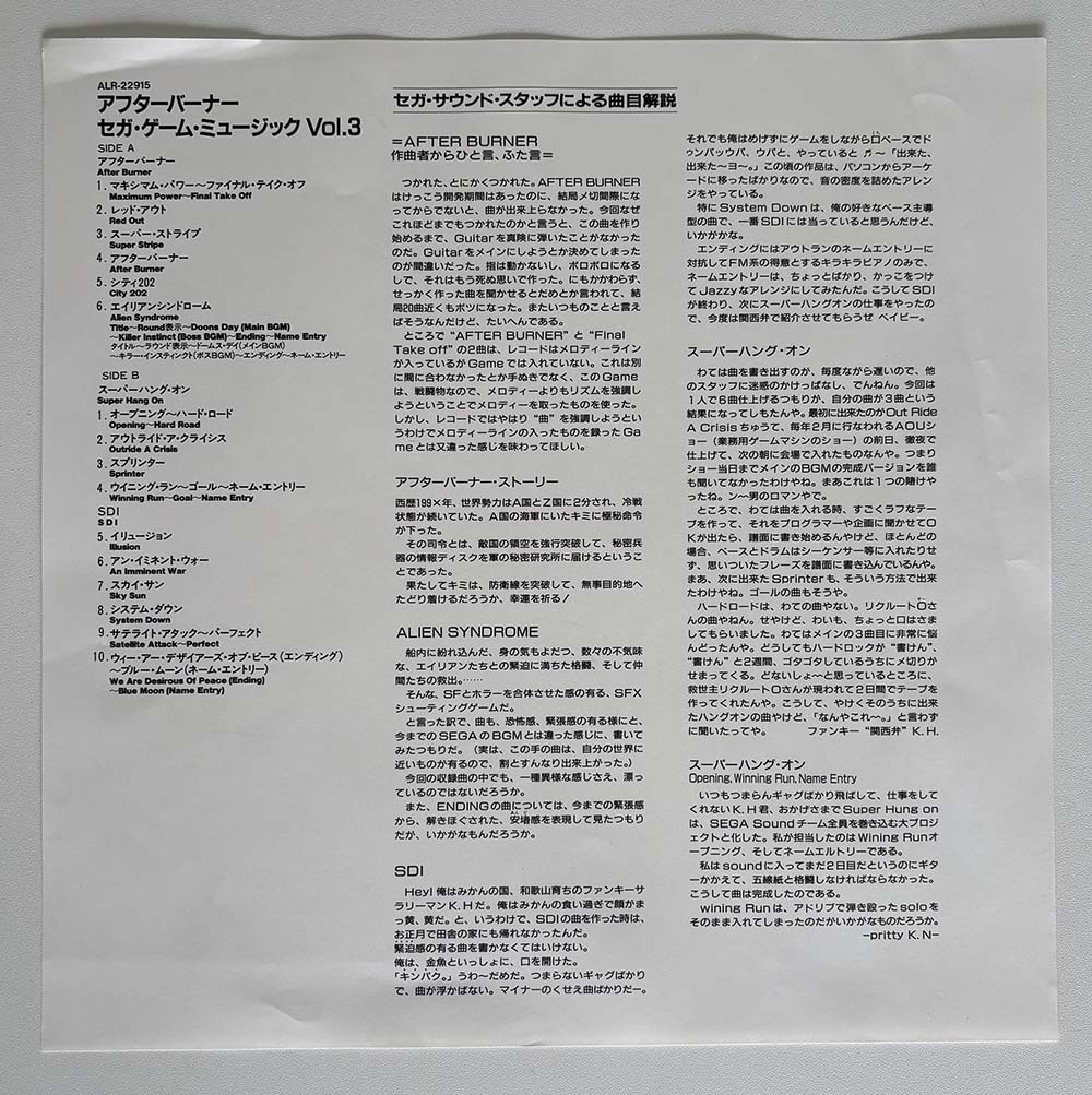 This is the third volume of the cult "SEGA Game Music" record series by Alpha Records, featuring the soundtrack for After Burner, Alien Syndrome, Super Hang On and SDI.