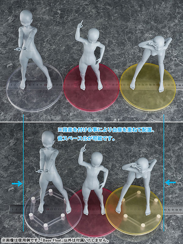 Base Float is a series of adjustable translucent support arms that can be placed below figure bases to elevate them. Subtle but functional, this product allows you to stack multiple figures on top one another to fully utilize your display space.