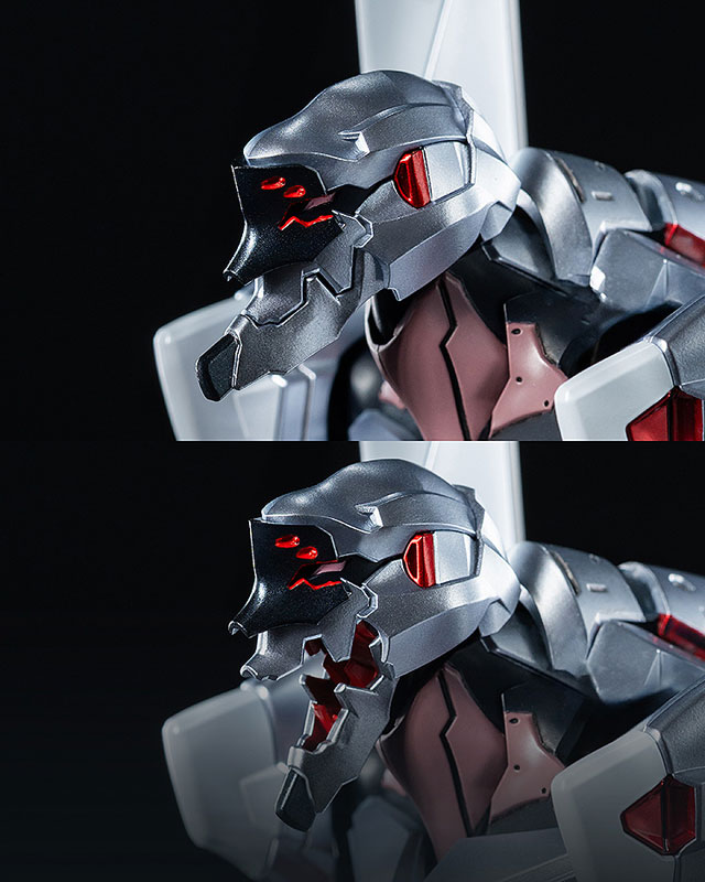 Additionally, it features a metallic paint finish which accentuates its intricate mechanical details, with a striking contrast between icy silver and fiery red that brings the figure to life.