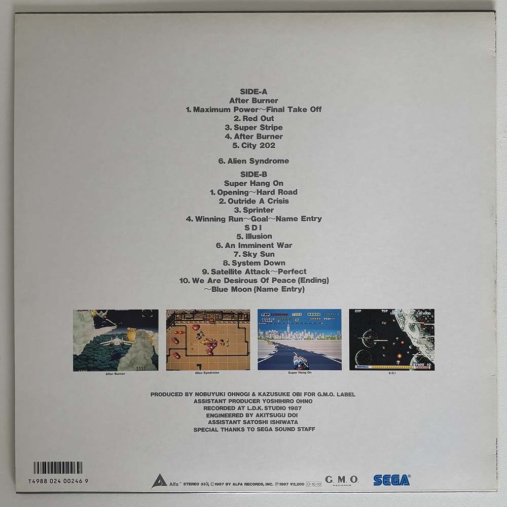 This is the third volume of the cult "SEGA Game Music" record series by Alpha Records, featuring the soundtrack for After Burner, Alien Syndrome, Super Hang On and SDI.